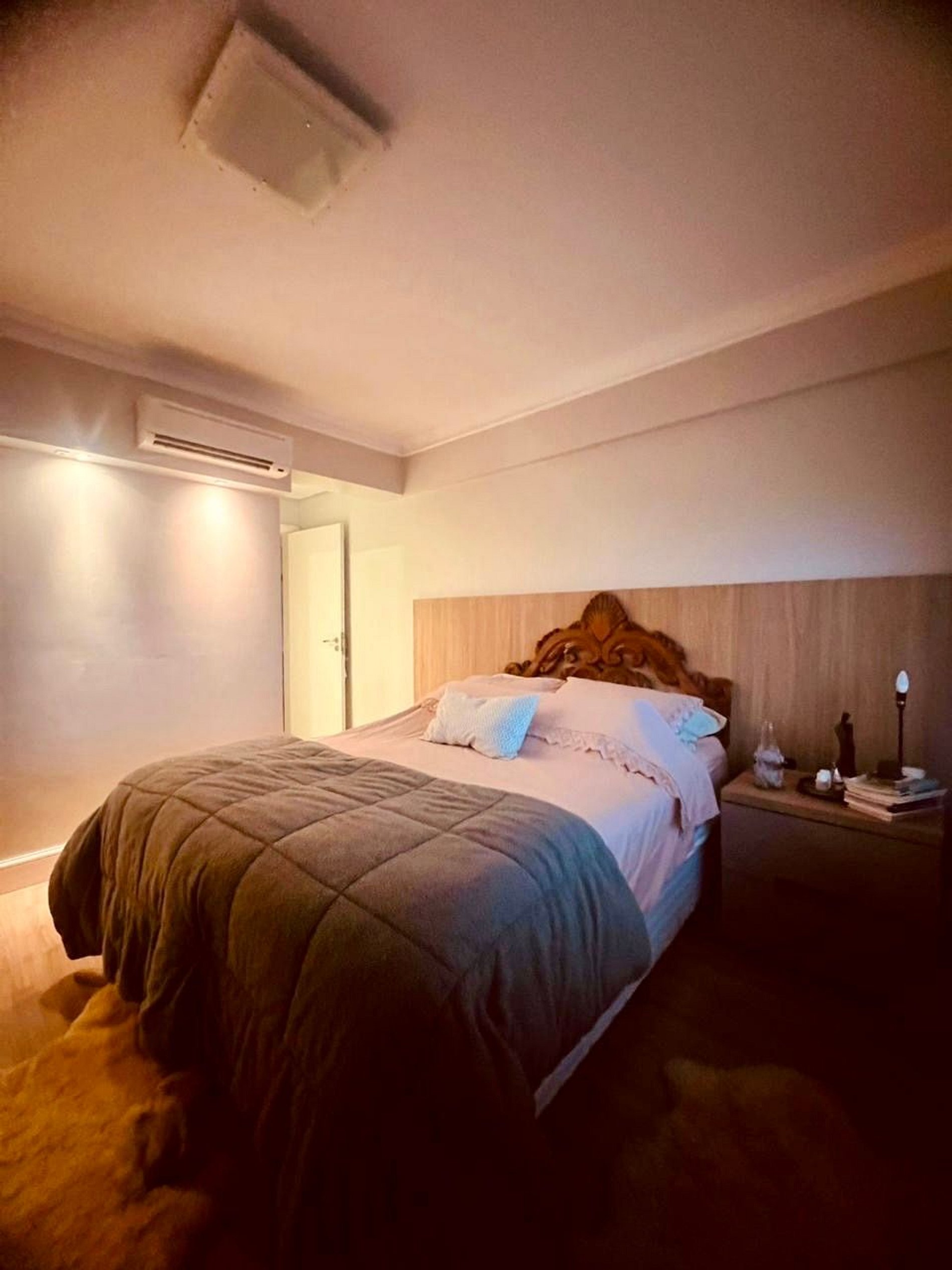 São 3 quartos, incluindo uma suíte com ar-condicionado.